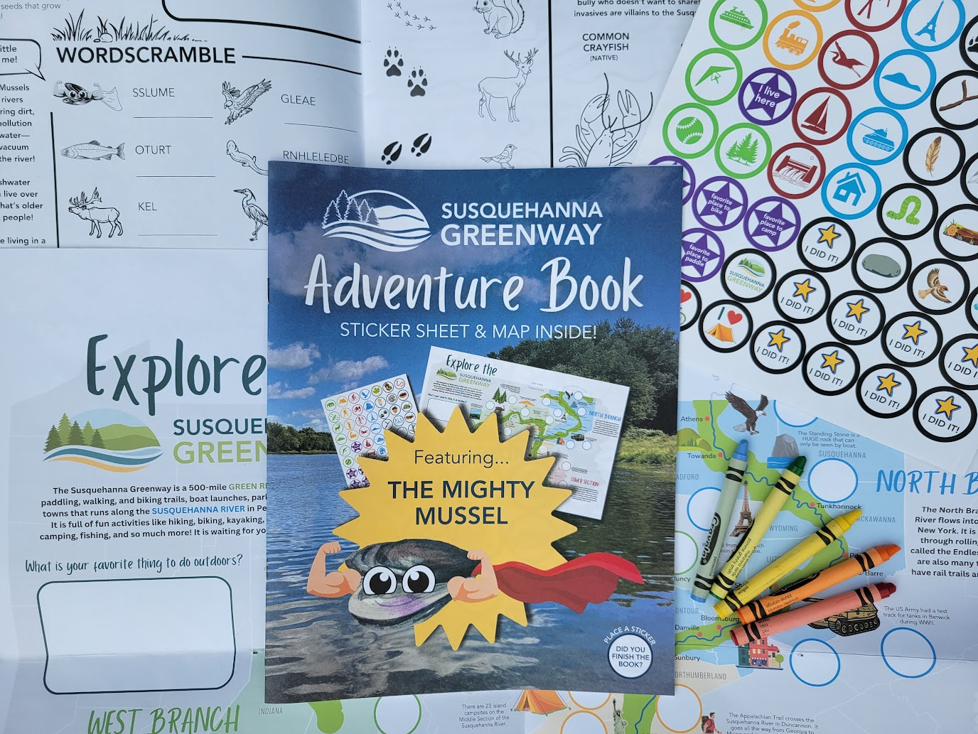 Lewisburg, PA – The Susquehanna Greenway Partnership (SGP) is excited to announce the release of a brand-new educational and activity-packed booklet designed just for kids: The Susquehanna Greenway Adventure Book, featuring none other than the Mighty Mussel!